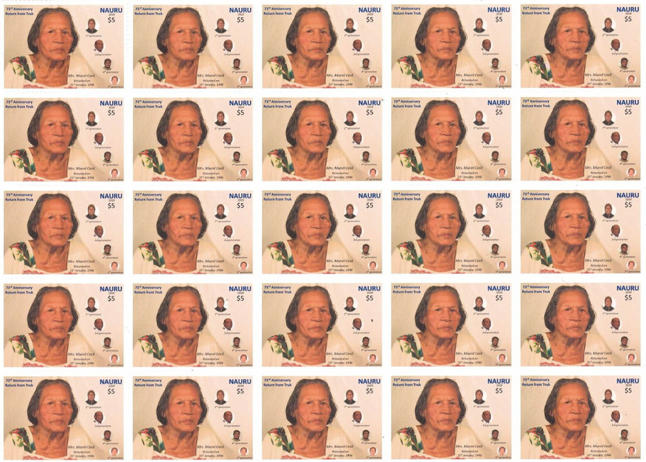 Nauru Post commemorated this significant event with a stamp issue in July 2021 for the 75th Anniversary of the Islanders' return from Truk (now Chuuk/Ruk) after the end of the second World War. The issue also included a First Day Cover. The 75th Anniversary was celebrated on January 31, 2021, which was also the designed as Nauru's Independence Day. Muriel Cecil was born in Nauru on 12 July 1926. During World War 2, she was exited to Truk Island when Japanese occupied Nauru in 1946. She's the oldest 93, passed away on the 30th of July 2019.